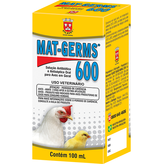MAT- GERMS 600 é indicado no tratamento da septicemia hemorrágica das aves, coriza infecciosa, micoplasmose, colibacilose, estafilocoses, onfalites, pulorose e tifo aviário.